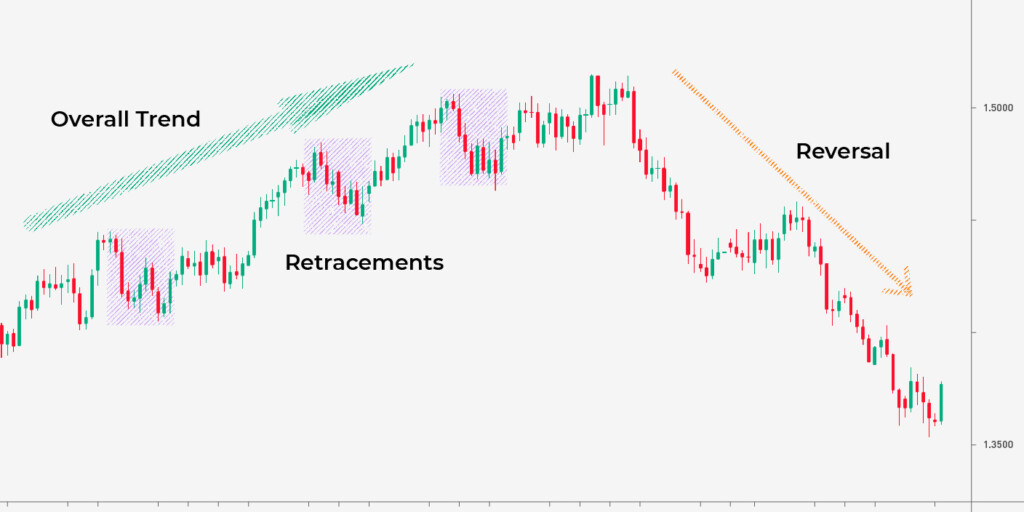 It’s vital to distinguish between a price retracement and a trend reversal. A retracement is a short-term price movement against the current trend but with a following return to it. Retracements occur in every trend that is bullish, bearish, or sideways.