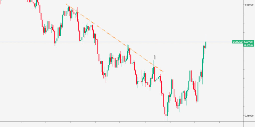 Look at the chart above. The price is moving within a downtrend. A trendline (orange line) serves as a resistance level. The price touched this level three times before the fourth retracement occurred (1). You could open a sell trade at that point. Also, you could implement a trailing take-profit order to move it depending on market conditions. A stop-loss level should be calculated considering the size of the take-profit point.