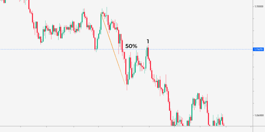 The chart above reflects such a situation. The price reached 50% of its previous move (1) and continued moving in a downtrend. You could open a sell trade as soon as the price formed a bearish candlestick after reaching the 50% point. Take-profit and stop-loss levels would depend on market conditions.