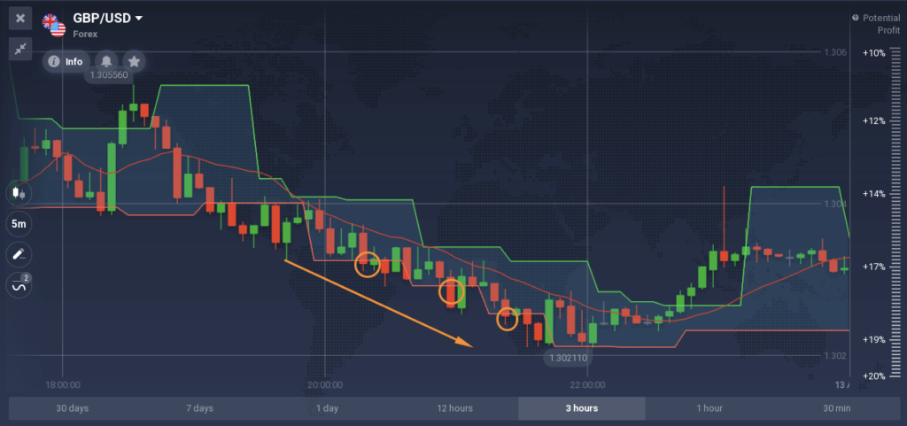 One common strategy to apply with this indicator is the breakout strategy. A buy signal is generated when the price chart moves within a narrow channel and breaks through the upper band from below. The opposite is also true — when the price moves in a narrow channel and breaks through the lower band, it’s associated with a sell signal. To protect your position, in the case of a buy trade, the stop loss can be trailed with the rising fractal line, and if you go for a sell trade, trail the stop loss with the falling fractal line.