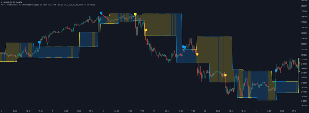 The upper band is created by connecting the price highs, while the lower band connects the price lows. As a result, the bands essentially follow the movement of the price chart but with a notable distinction — they smooth out the price noise, focusing solely on significant price movements. By observing these bands, traders can easily assess whether the market is in a trending or non-trending phase.