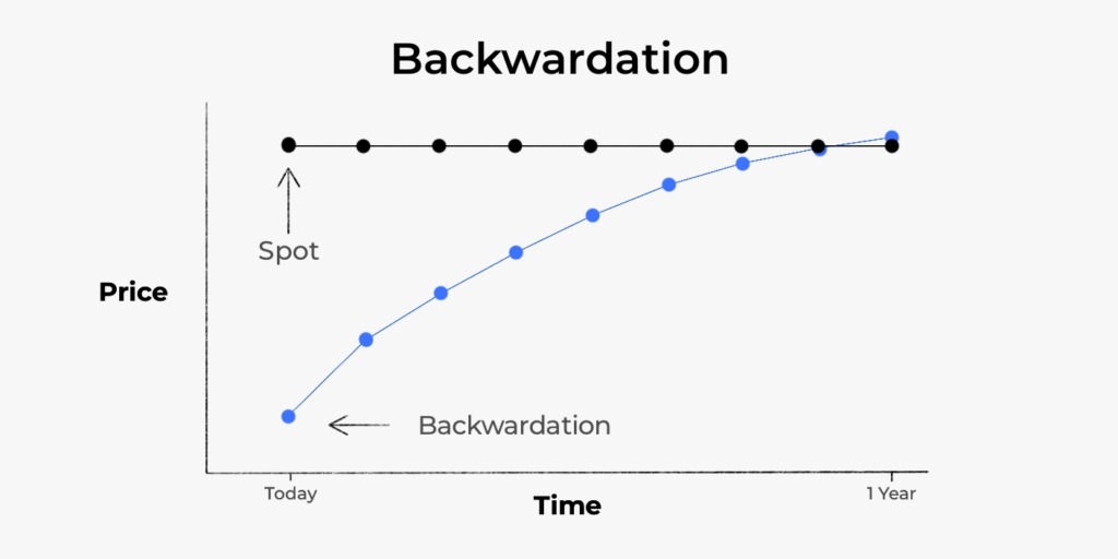When the spot price of a commodity or asset becomes higher than the future price, such commodity or asset is said to be in Backwardation. This is often due to the scarcity of commodities in the market.