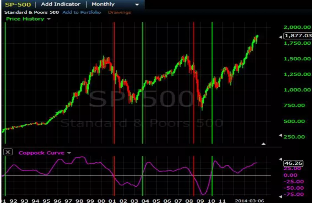 Diagram showing S&P 500 monthly chart with Coppock Curve