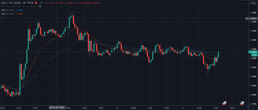 A shorter time frame is a good choice for first-time day traders. First-time swing traders should consider a more prolonged time frame when trading the EMA crossover. Whenever the 20-period line crosses over the 50-period line, it creates your best chance to go long.