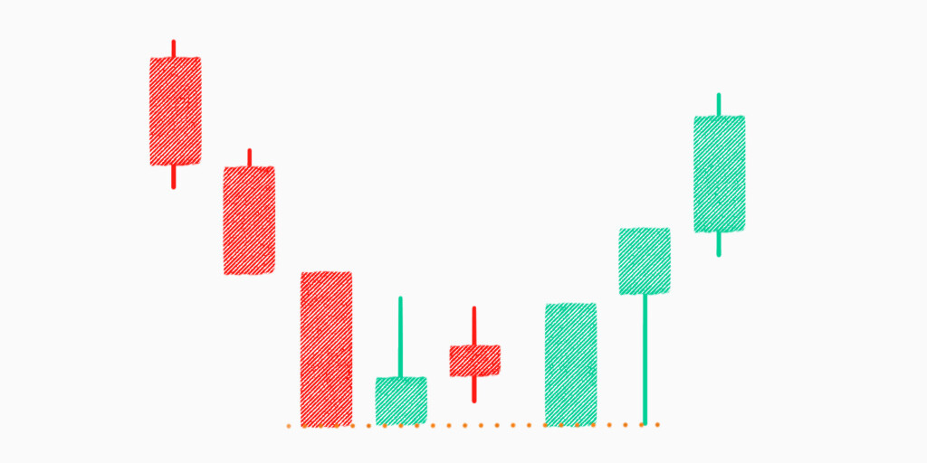 Let’s say you’re trading a stock, and the price moves lower and breaks below the near-term low. However, it shows the first sign of upcoming bullish pressure with an indecision candle, followed by a bullish hammer.