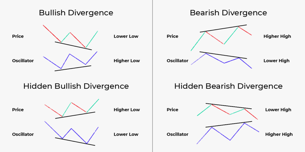 आरएसआई संकेतक का उपयोग विचलन संकेतों के लिए भी किया जा सकता है। नियम एमएसीडी संकेतक के समान हैं, लेकिन विचलन एक मूल्य और आरएसआई लाइन के बीच होता है, न कि हिस्टोग्राम।