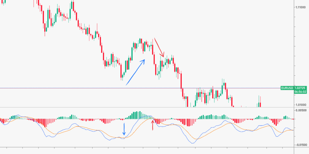 एमएसीडी संकेतक का उपयोग करने का एक और तरीका एमएसीडी और सिग्नल लाइनों के क्रॉसओवर की जांच करना है। जब एमएसीडी लाइन सिग्नल लाइन के ऊपर टूट जाती है, तो यह एक खरीद संकेत है। जब एमएसीडी लाइन सिग्नल लाइन से नीचे आती है, तो यह एक बिक्री संकेत है।