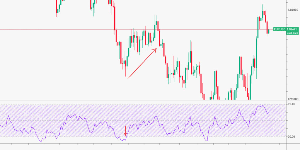 • जब लाइन 0-30 की सीमा में चलती है, तो यह ओवरसोल्ड बाजार की स्थिति का संकेत है। जब लाइन 30 के स्तर से ऊपर टूटती है, तो यह एक खरीद संकेत है।