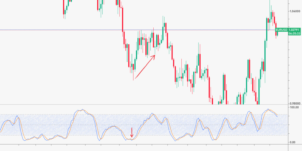 यदि धीमी रेखा 0-20 रेंज में तेज रेखा के ऊपर टूट जाती है तो आप खरीद सकते हैं। यदि धीमी रेखा 80-100 रेंज में तेज रेखा के नीचे टूट जाती है तो आप बेच सकते हैं। लाइनों के उतार-चढ़ाव का उपयोग विचलन संकेत के लिए भी किया जा सकता है।