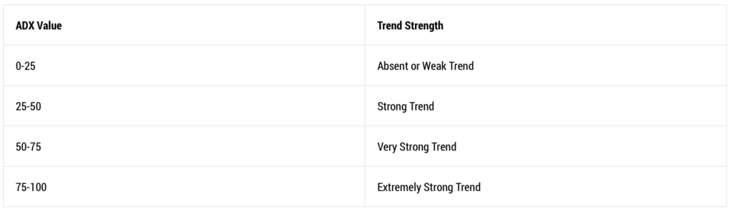 एडीएक्स लाइन स्वयं निर्धारित करती है कि वर्तमान प्रवृत्ति कितनी मजबूत है। यह 0-100 की सीमा के भीतर चलता है।