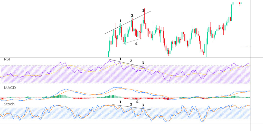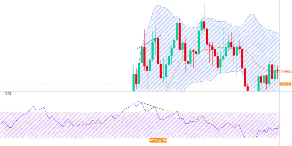 Divergence is a market condition in which an indicator doesn’t follow price movements. Look at the picture below.
