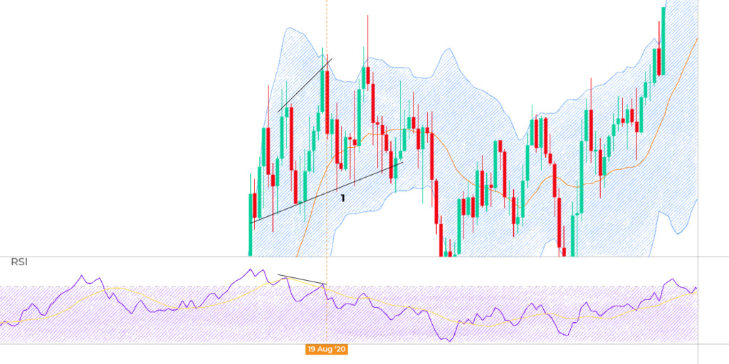 You could also use another regular bearish divergence. The RSI indicator again was in the overbought area. When the price formed a higher high and the RSI indicator went down, the price was near the upper band of the Bollinger Bands indicator. It was the signal the price would decline soon. After the RSI indicator left the overbought area, you could open a sell position and place the take-profit order at the level determined by the trendline (1). In this case, the closest low wouldn’t help you. You should rely on the trendline.