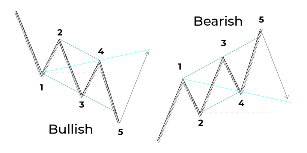 On the other hand, if you have an ascending channel, then you will see the formation of a bearish pattern. You will see higher lows and higher highs, which indicate an uptrend. A bearish trend will start at the breakout when the 5th wave forms.