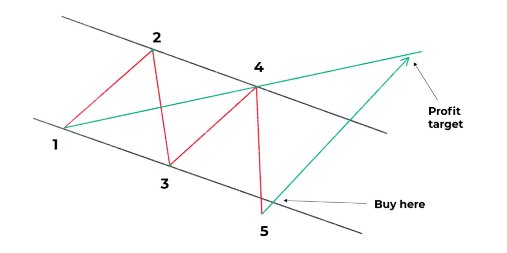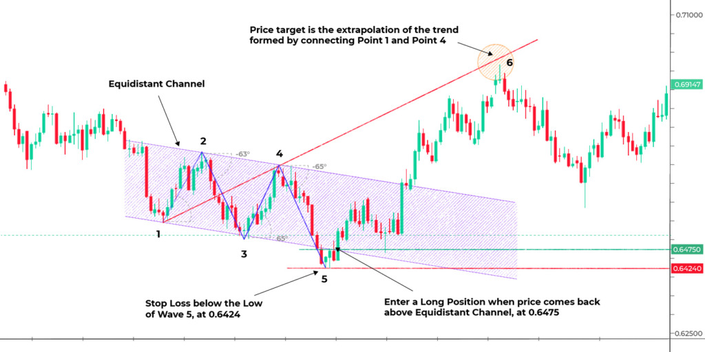 You need to look for two symmetrical waves. For instance, waves 3-4 should be in the same channel created by waves 1-2. The final wave, wave 5, should be the one breaking from the channel, signaling that a Wolfe Wave has just formed.