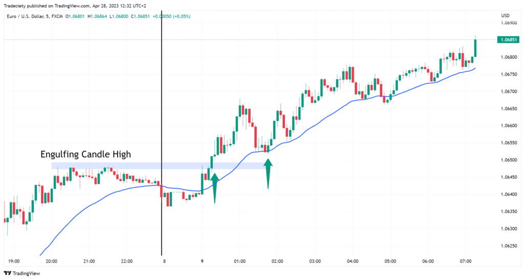 When you switch to a smaller timeframe, you can find an entry point by marking the high of a bullish candlestick pattern and entering a buy trade at its breakout. This can help you take advantage of a longer-term strong bullish trend.
