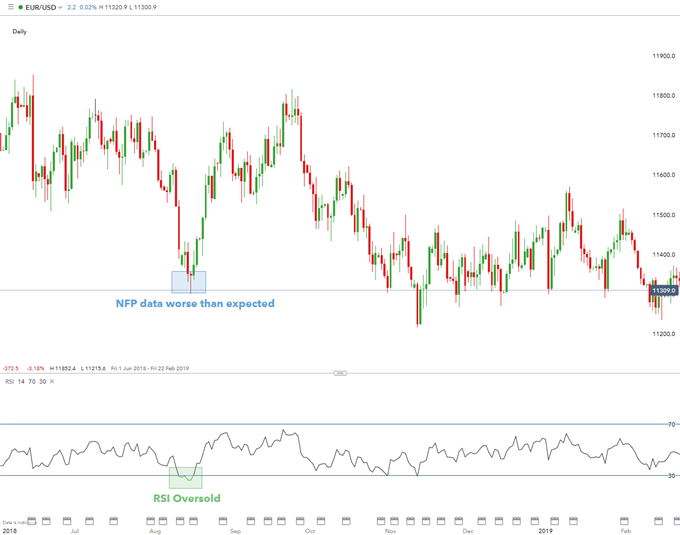 For example, when the NFP figure falls below estimates, causing the USD to weaken, while the RSI indicator is in the oversold area, this can enhance a decision to buy the EUR/USD pair.