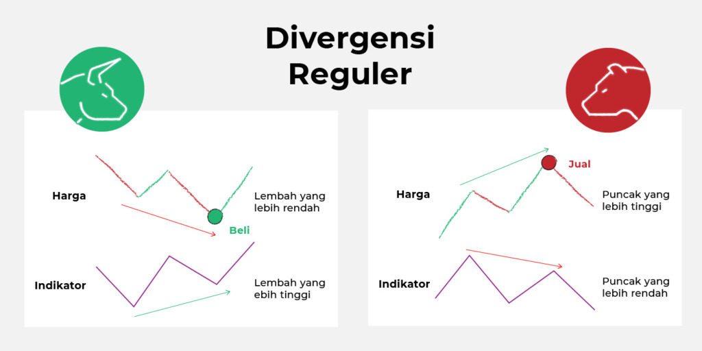 Ada dua jenis divergensi – reguler dan tersembunyi. Divergensi reguler menandakan pembalikan harga, sedangkan divergensi tersembunyi mengkonfirmasi tren. Keduanya dapat ditemukan dalam tren bullish dan bearish.