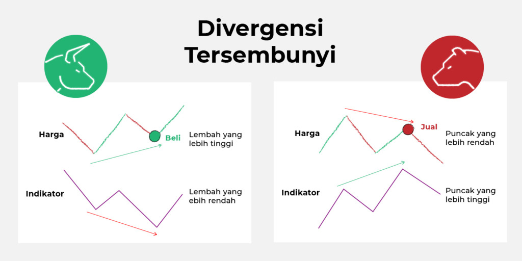 Divergensi bearish tersembunyi adalah situasi di mana harga turun, membentuk nilai tertinggi yang lebih rendah, tetapi indikatornya naik, menciptakan nilai maksimum yang lebih tinggi. Ini adalah sinyal bahwa harga akan terus bergerak dalam tren turun. Anda dapat menjaga trading Anda tetap terbuka atau memasuki pasar dalam arah tren.