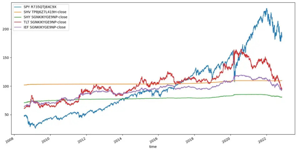 Generally, short-term assets have lower risk exposure than others’ long termed treasuring against the market. It can be seen below that the relative price movement of SHY, SHV, IEF, and TLT are close when compared to that of SPY.