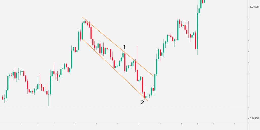 Placing trendlines is a simple pullback trading strategy. The chart below shows a pullback (1) within a downtrend of the EUR/USD pair. You could sell after the price touched the upper trendline and close the trade at the lower trendline (2).