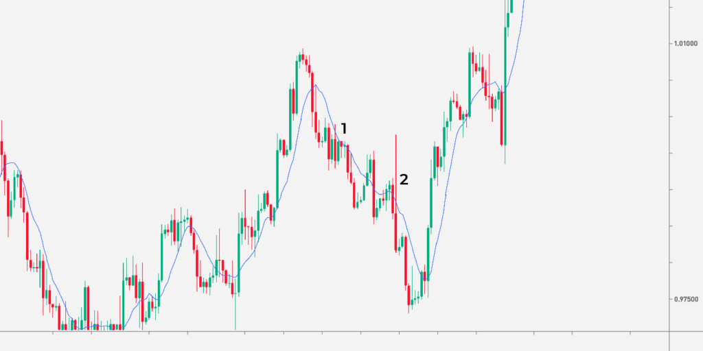 A moving average resembles a trend and moves above the price in a downtrend and below the price in an uptrend. This makes it a useful tool for identifying entry points. Look at the chart above: points 1 and 2 show potential entries for sell trades.