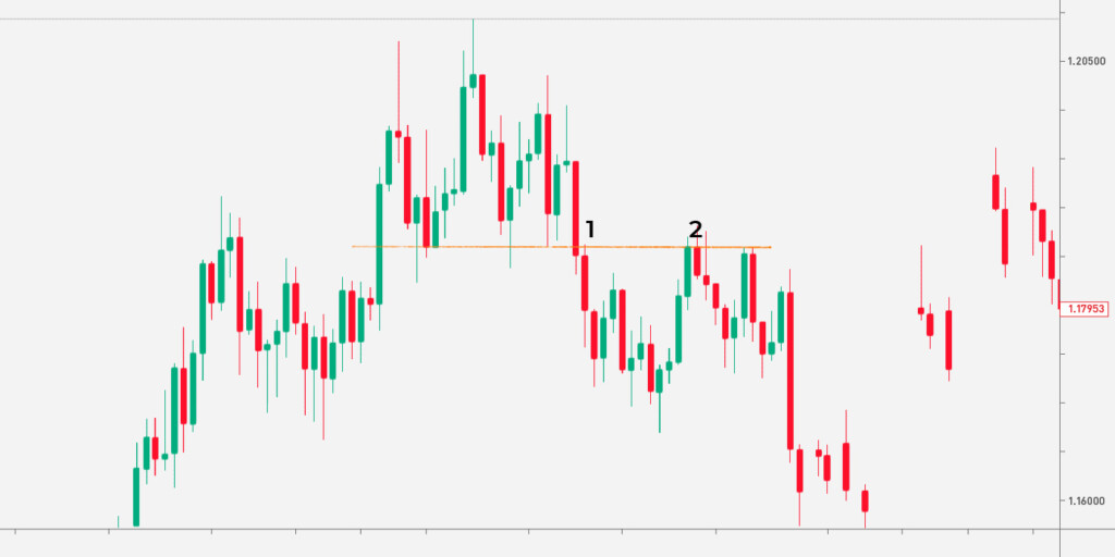 On the chart above, there is a head-and-shoulders pattern. The price broke below the neckline (1), signaling a beginning of a downtrend. After, the bulls tried to push the price again (2). However, they failed, and the price continued to decline. You could open a sell trade after the pullback (2).
