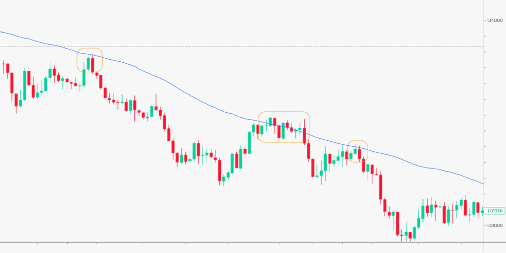 MA’yı destek ve direnç seviyeleri olarak kullanabilirsiniz. Ancak bu sinyal kısa-vadeli zaman aralıklarında daha iyi çalışacaktır. Daha yüksek grafiklerde MA, sınır işlevi görmek üzere fiyattan uzaklaşacaktır.