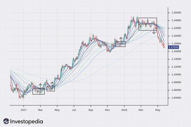 Bu strateji trend değişikliği için uygulanır. Bir grafikte sekiz ile 15 üstel (exponential) MA uygulamanız gerekir. Çok sayıda EMA kullanmak, işlemcilerin trendin hem gücünü hem de yönünü belirlenmesini sağlar. Güçlü bir trend, MA’ların daha dik açı olması ve aralarında daha geniş bir mesafe olması ile belli olur.