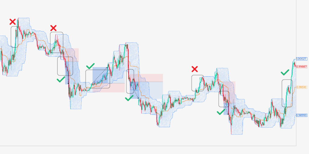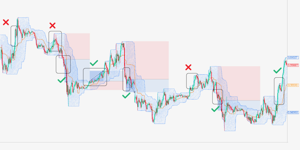 Now, you can see we have appropriately defined entries with clear criteria of where our stop loss should go. Just use the swing highs and lows as your stop. You’ll notice that after getting stopped out, the trend tends to reverse in the opposite direction before touching the opposite bound.